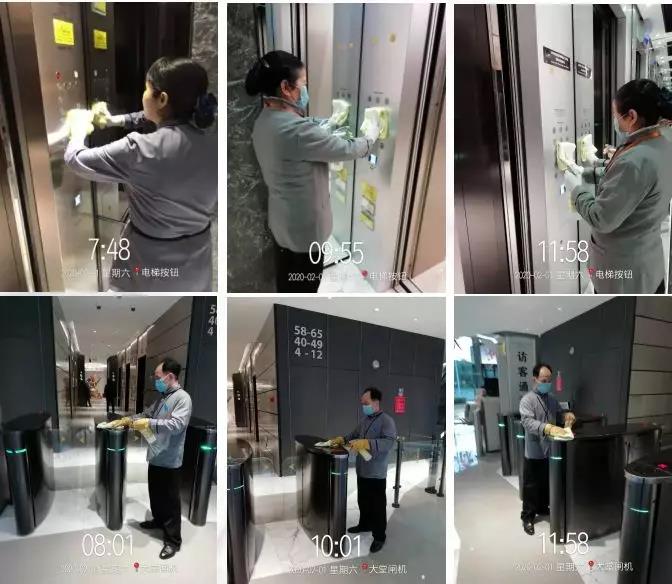 、17:20-18:00)安排保洁员定岗,使用德国进口的德倍洗消毒清洁剂频繁消毒。星空电竞金融大厦使用香港邓氏万能消毒清洁剂进行清洁消毒,频次保持每2小时一次,上下班高峰期为每1小时一次。同时加强各出入口通道、手扶梯、洗手间等区域的消毒频次。