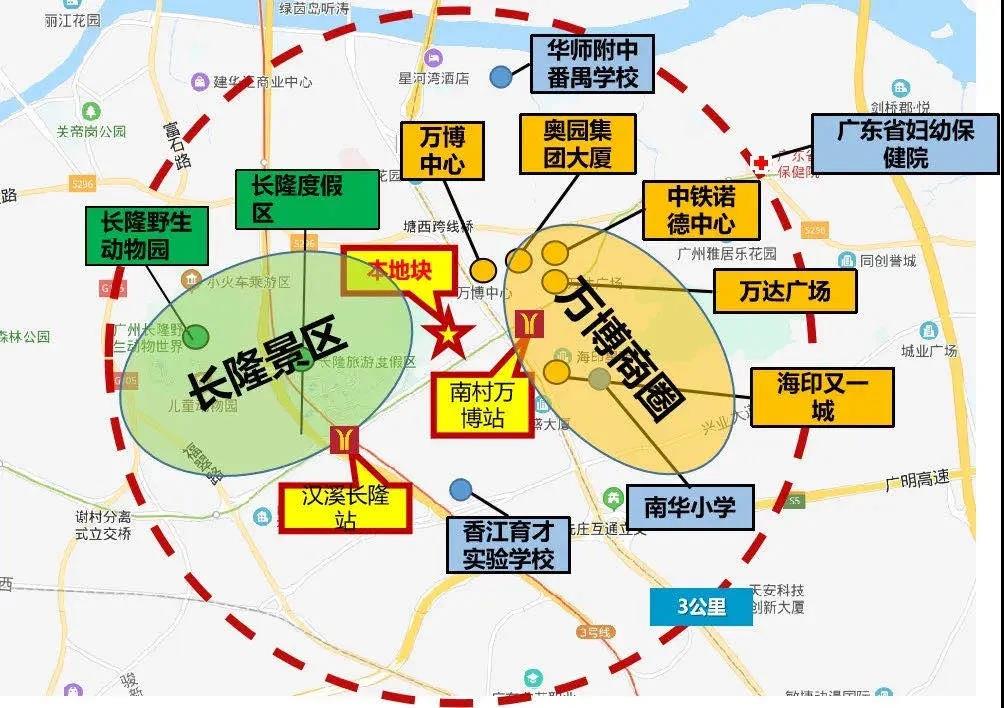 地块周边配套成熟,有广东省妇幼保健院、华师附中番禺学校、南华小学、香江育才小学等优质配套环绕,更坐拥万达广场、长隆景区等文娱资源,具备可观的升值潜力。