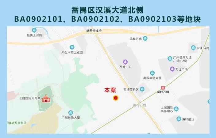地块位于番禺区核心区域,地理位置极为优越:位于广州中心区域南部,为珠江新城CBD的南向延伸,距珠江新城约17公里、30分钟车程;西面紧邻长隆景区,景观资源优越;东面为万博商圈,商业氛围浓厚;距离地铁3号线汉溪长隆站及南村万博站仅1公里左右;向北2公里可达华南快速,向西2公里可达新光快速;地块东面紧邻番禺大道北。