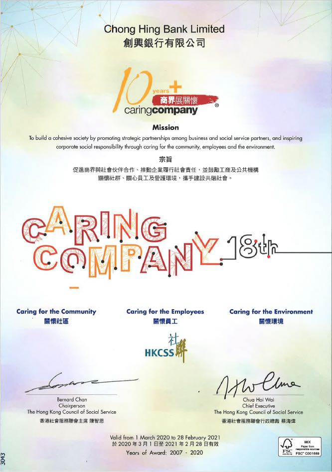 获香港社会服务联会颁授“连续10年商界展关怀”标志;