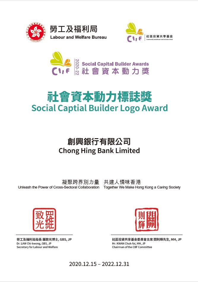 获劳工及福利局辖下的“社区投资共享基金”颁发“社会资本动力标志奖2020”;