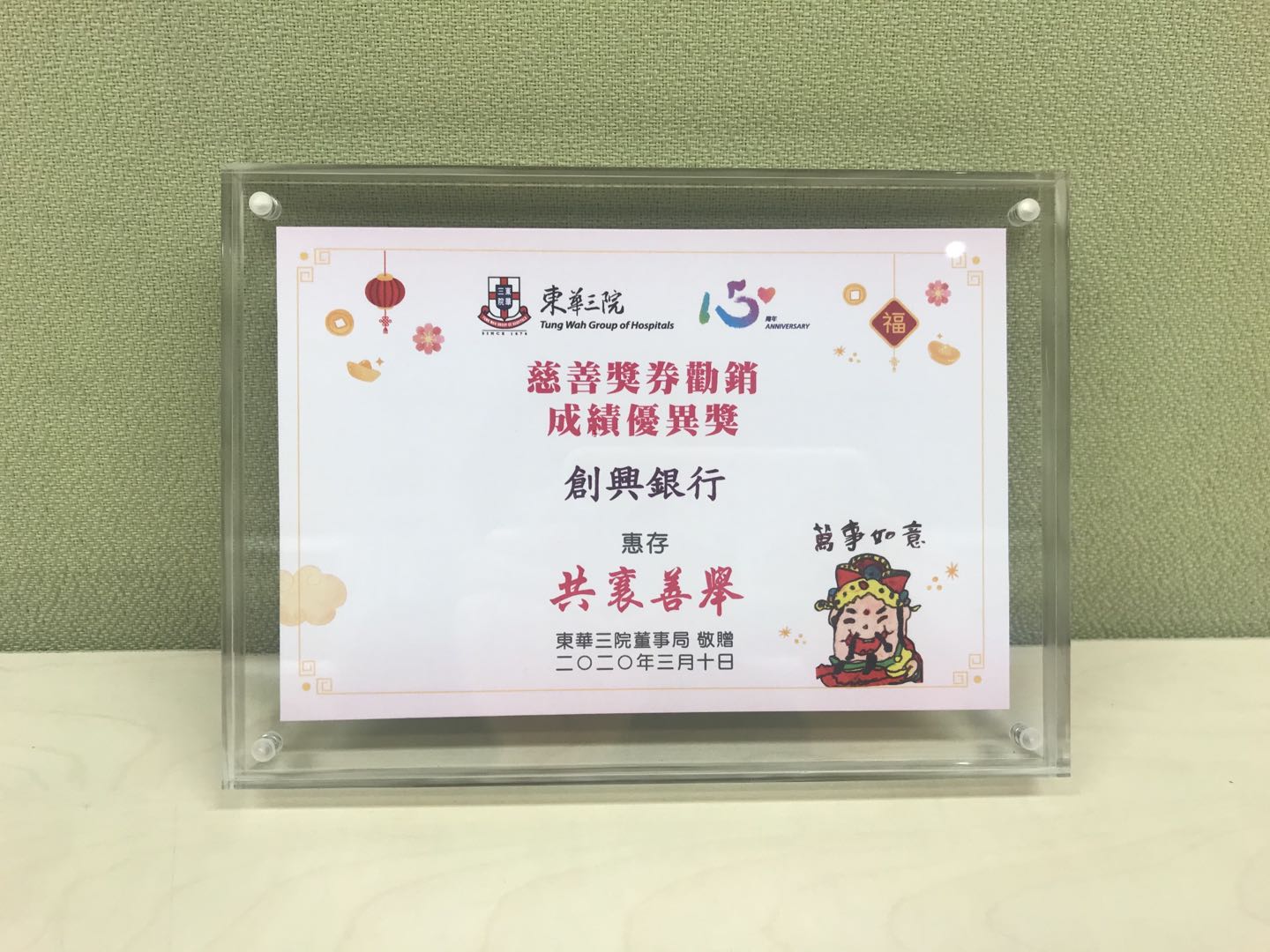 获东华三院颁发“慈善奖券义卖比赛工商机构及团体组季军”及“慈善奖券劝销奖”。