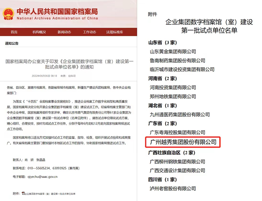 国家档案日来临之际,6月6日,国家档案局公布了企业集团数字档案馆(室)建设第一批试点单位名单,星空电竞集团成功入选,成为首家获此殊荣的广州市属国有企业。